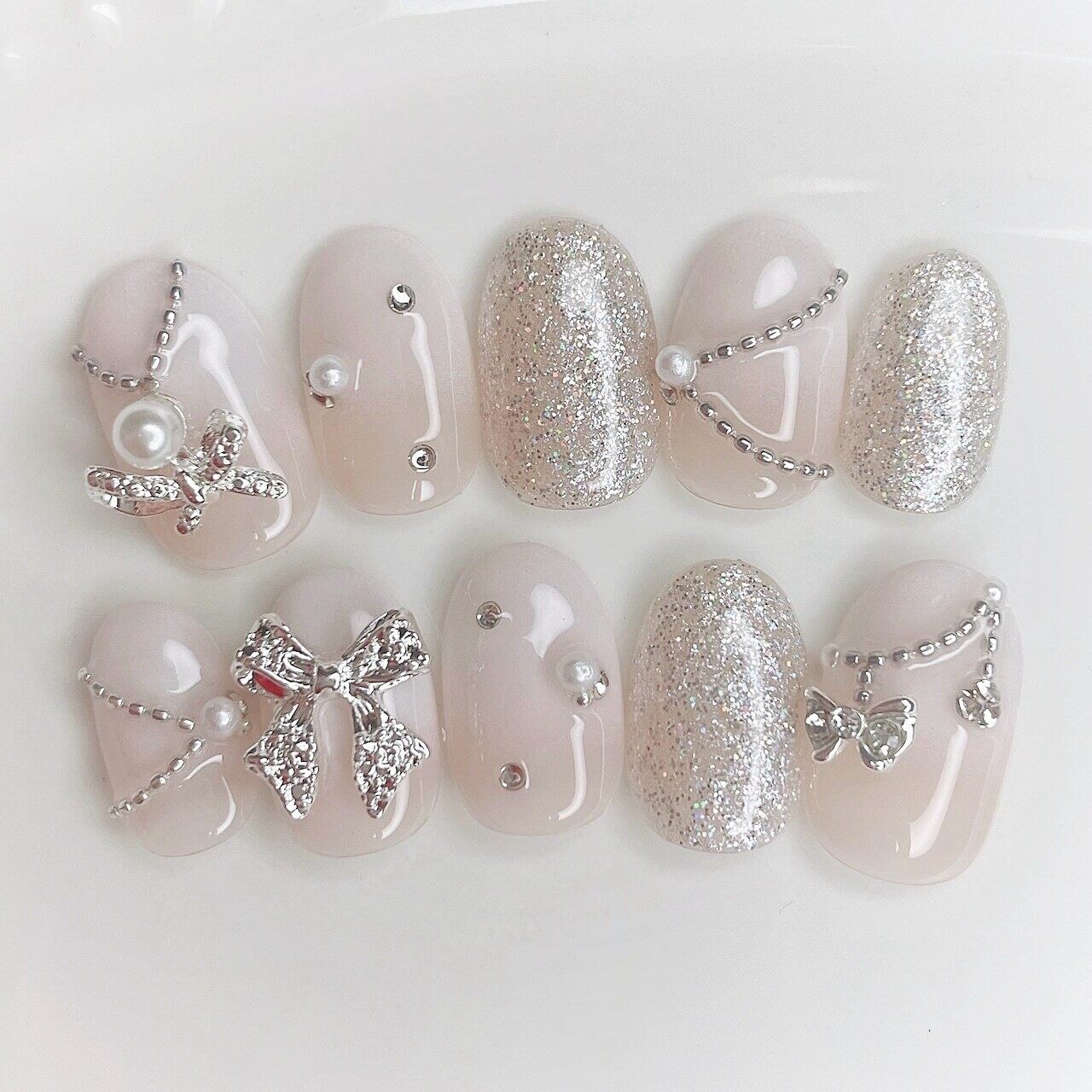 統一感のある色味と上品な輝きのシルバーパーツが洗練された美しさのネイルチップです。